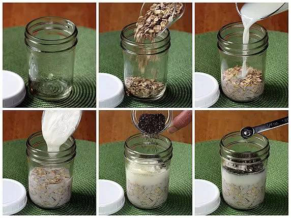Všechny suroviny kromě ovoce vložíme do nádoby, uzavřeme a pořádně protřepeme. Potom přidáme ovoce a promícháme lžící. Kaši můžeme konzumovat hned, případně vložit do chladničky a nechat na později. Kaše vydrží v lednici 4 dny.