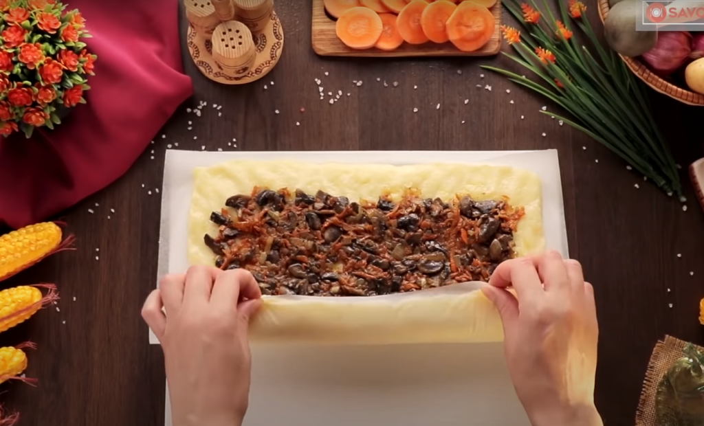 Pak si nastrouháme mrkev, nakrájíme cibuli a přidáme k žampionům. Promícháme a spolu restujeme asi 3 minuty. Osolíme, opepříme a promícháme. Tuto náplň navrstvíme rovnoměrně na bramborovou masu tak, že necháme volné asi 2 cm od kraje. Potom opatrně srolujeme a dáme péct do trouby na 190 ° C po dobu 30 minut. Přejeme dobrou chuť!